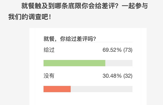 用餐后做出評價,是消費者的基本權(quán)利。針對“就餐差評”的問題,深圳新聞網(wǎng)昨天發(fā)起了網(wǎng)友投票。結(jié)果,有69.52%的網(wǎng)友表示,他們曾經(jīng)在用餐后給過差評。在給出差評的原因中,“服務(wù)態(tài)度差”、“太難吃”高居前兩名。對商家提出中肯的批評與監(jiān)督,是每個消費者享有的基本權(quán)利,中肯的評價不僅是商家進步的動力,也讓更多網(wǎng)友能夠快速篩選定位商家,從而促進行業(yè)的良性發(fā)展。