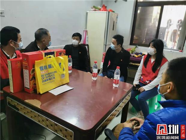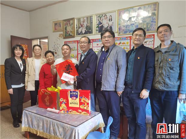 隨后,陳鵬、藍岸率領報業(yè)集團紀檢監(jiān)察室黨支部、深圳新聞網(wǎng)黨總支部黨員代表,在清水河街道黨工委副書記劉曉春、街道四級調研員陳小龍、梅園社區(qū)黨委書記曾建輝、副書記陳秋珊等人的陪同下,對梅園社區(qū)抗疫先鋒黨員、單親婦女、困難居民、殘疾人士進行分組探訪慰問并送上新春祝福。大家?guī)厦篮玫淖8!⑾矐c的春聯(lián)、慰問金、臘腸等慰問品,分四組慰問走訪。