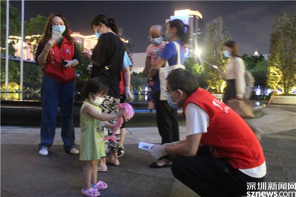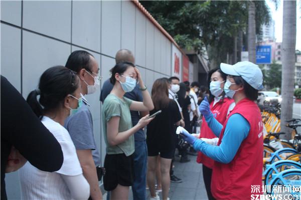 最早到達(dá)老圍社區(qū)的下沉干部是羅湖區(qū)財政局副局長朱健全,他一來就遇到了核酸檢測,跟社區(qū)工作人員一起布置檢測現(xiàn)場,協(xié)助居民登記健康碼、出示行程碼。有居民帶著孩子來做檢測,他又臨時當(dāng)起了保育員,以便孩子的媽媽順利檢測。身穿紅馬甲的他看起來就是一個經(jīng)驗(yàn)豐富極富愛心的義工。