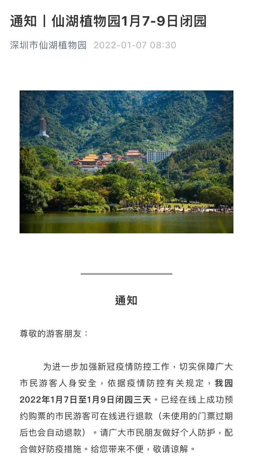 據(jù)深圳市仙湖植物園官方微信號(hào)1月7日8點(diǎn)30分發(fā)布的通知, 為進(jìn)一步加強(qiáng)新冠疫情防控工作,切實(shí)保障廣大市民游客人身安全,該園1月7日至1月9日閉園3天。已經(jīng)在線上成功預(yù)約購(gòu)票的市民游客可在線進(jìn)行退款(未使用的門(mén)票過(guò)期后也會(huì)自動(dòng)退款)。
