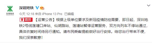根據(jù)上級(jí)單位要求及新冠疫情防控需要,即日起,深圳地鐵2號(hào)線蓮塘口岸站、仙湖路站、蓮塘站暫停運(yùn)營(yíng)服務(wù),雙方向列車不停站通過(guò),具體恢復(fù)時(shí)間待另行通知。請(qǐng)市民乘客提前做好出行安排。