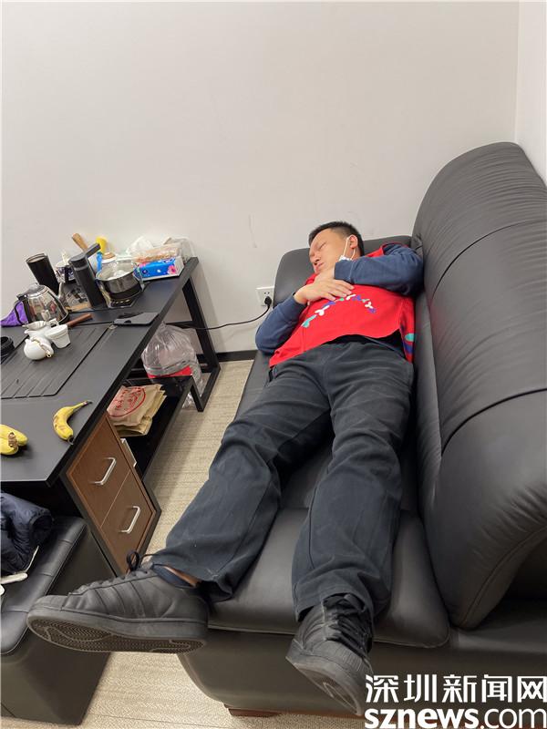 1月10日凌晨5點(diǎn)多,桂園街道桂木園社區(qū)黨委書記劉劍從核酸檢測點(diǎn)回來,躺在辦公室的沙發(fā)上,連身上的紅馬甲都沒有脫就睡著了。