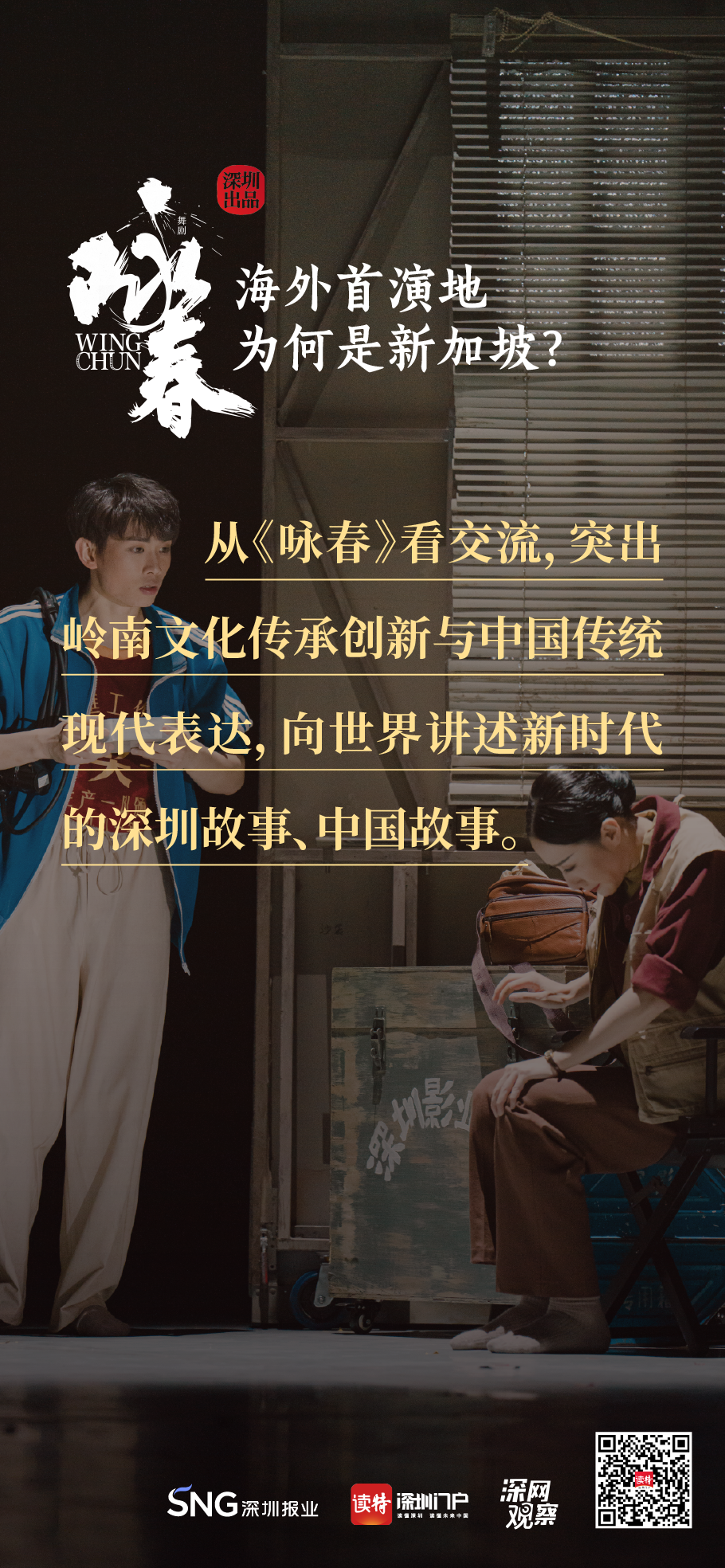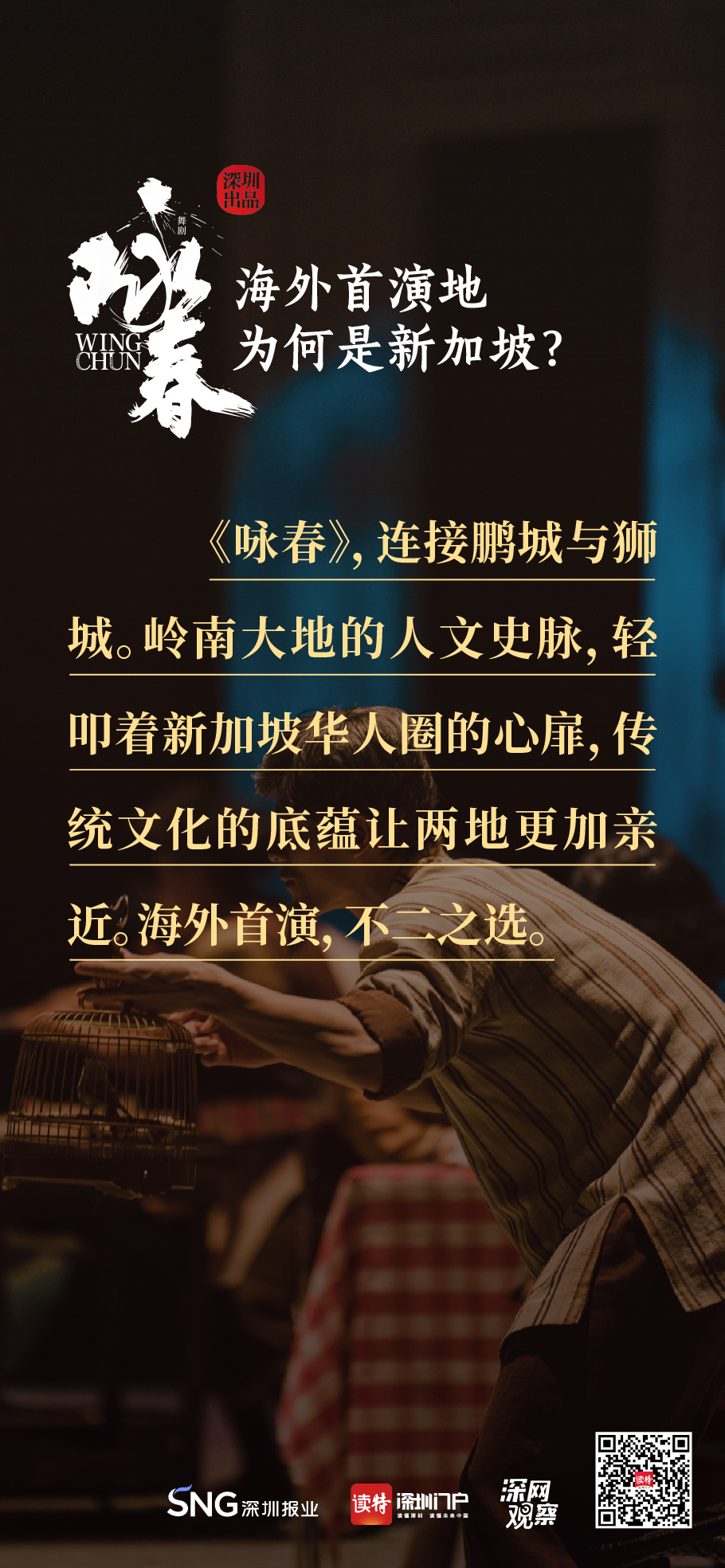 《詠春》書寫平凡英雄的傳奇,開詠春的一扇門,只為追尋心中的那一束光?!对伌骸罚B接鵬城與獅城,嶺南大地的人文史脈,輕叩著新加坡華人圈的心扉,傳統(tǒng)文化的底蘊(yùn)讓兩地更加親近,海外首演,不二之選。