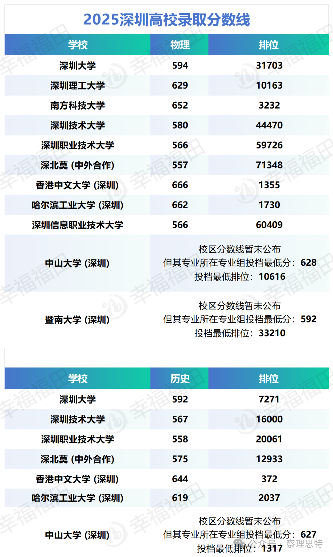 2025年深圳高校的投檔情況整體表現(xiàn)優(yōu)異,既有深圳大學、哈爾濱工業(yè)大學(深圳)、南方科技大學等頂尖院校領跑,也有深圳理工大學、深圳技術(shù)大學等新興高校快速崛起,職業(yè)本科院校如深圳職業(yè)技術(shù)大學也表現(xiàn)亮眼。
