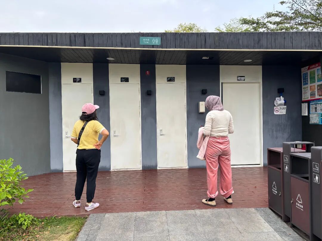 記者抵達公園后,依據公園內公告欄信息得知,除停車場處有一座公廁外,公園內部還有三處公廁,隨后記者逐一前往查看。雖然是周二下午,公園內已有不少市民游玩。記者跟隨指示牌來到第一處公廁,這也是距離公園入口最近且網友爆料如廁難的公廁。然而,按照指示牌指引,記者并未直接看到公廁,而是需走一段山路才能到達。到達時,已有部分市民在排隊。該公廁共有四個獨立隔間,其中一處為無障礙公廁,且均不分男女。記者排隊大概花費7、8分鐘才排到,工作日尚且如此,節(jié)假日市民如廁難問題必定更為突出。