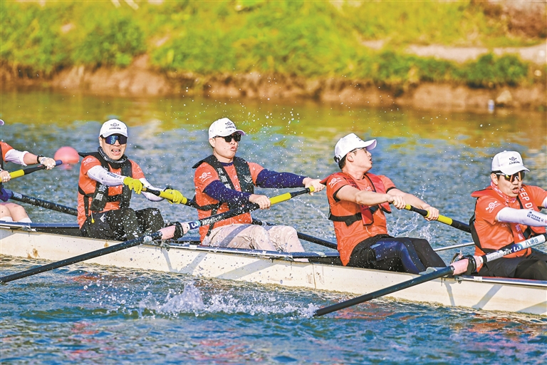 隨著發(fā)令汽笛聲響起,一艘艘賽艇劃破碧波,運(yùn)動員們揮槳如飛。岸邊觀眾的吶喊助威聲此起彼伏。