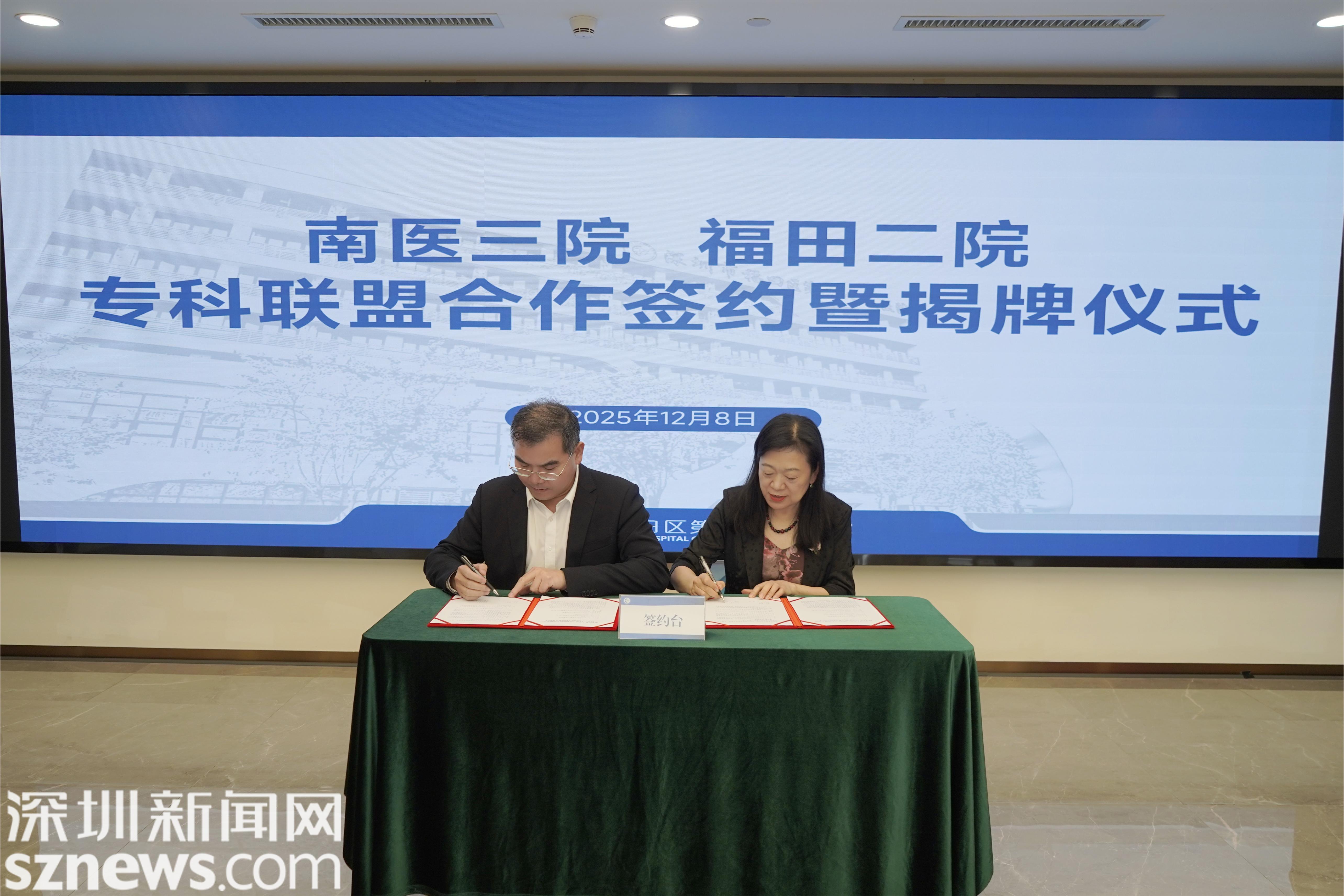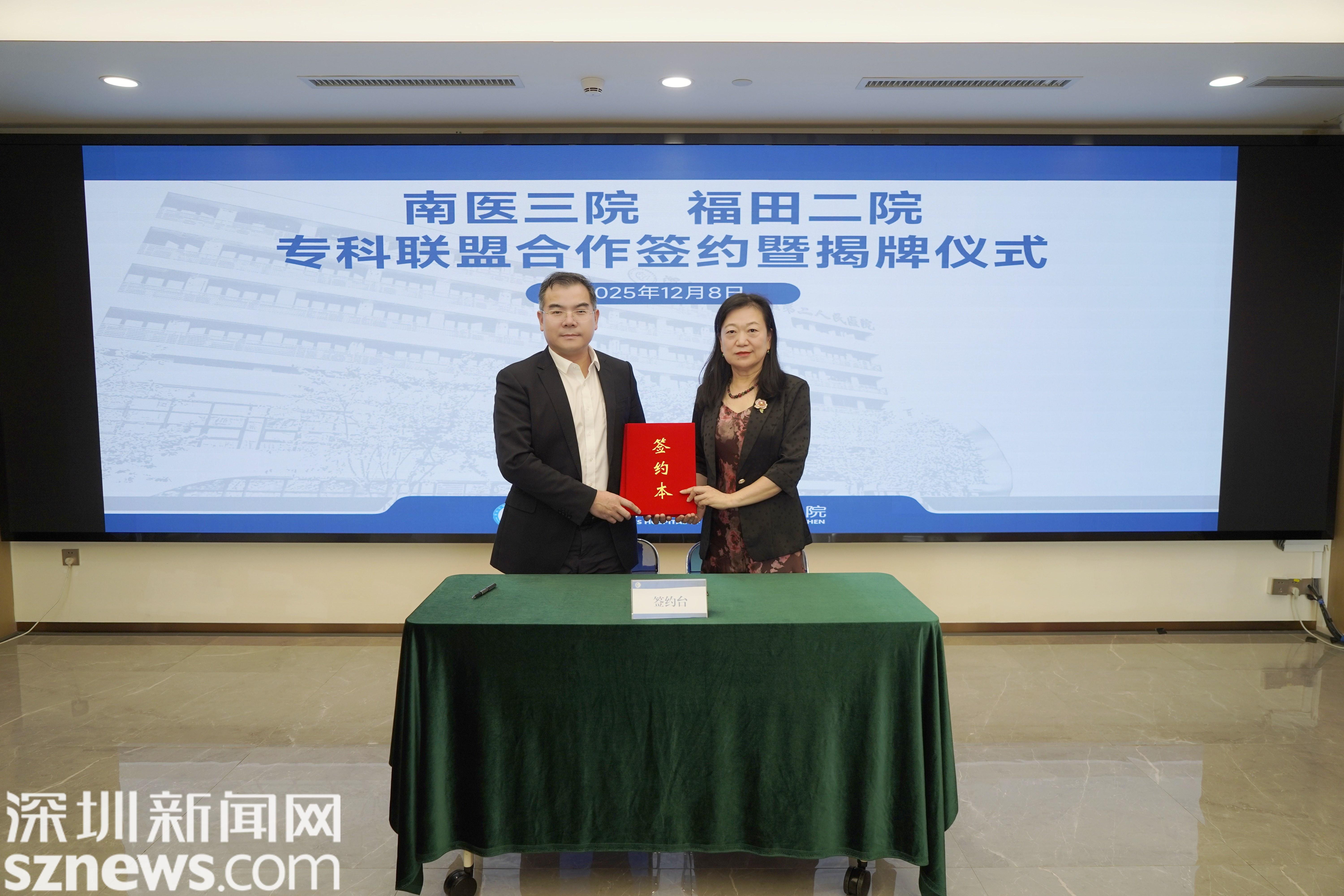 簽約儀式上,院長(zhǎng)黎程、趙蓉代表雙方醫(yī)院簽署《南方醫(yī)科大學(xué)第三附屬醫(yī)院與深圳市福田區(qū)第二人民醫(yī)院??坡?lián)盟合作協(xié)議》。