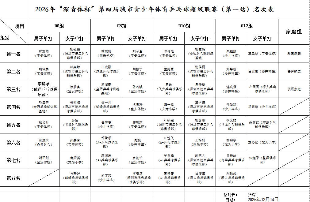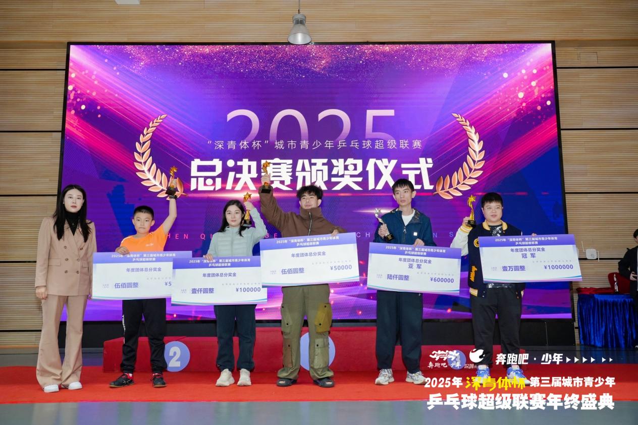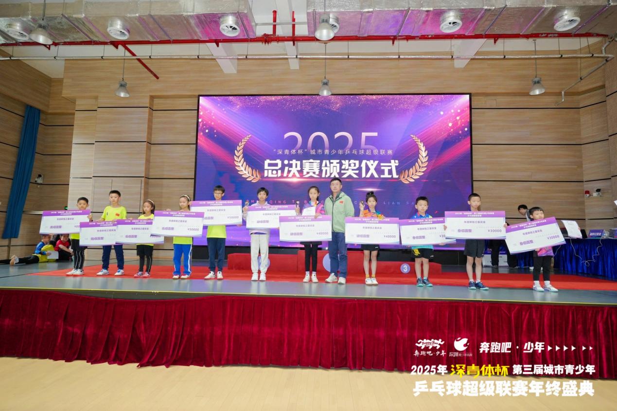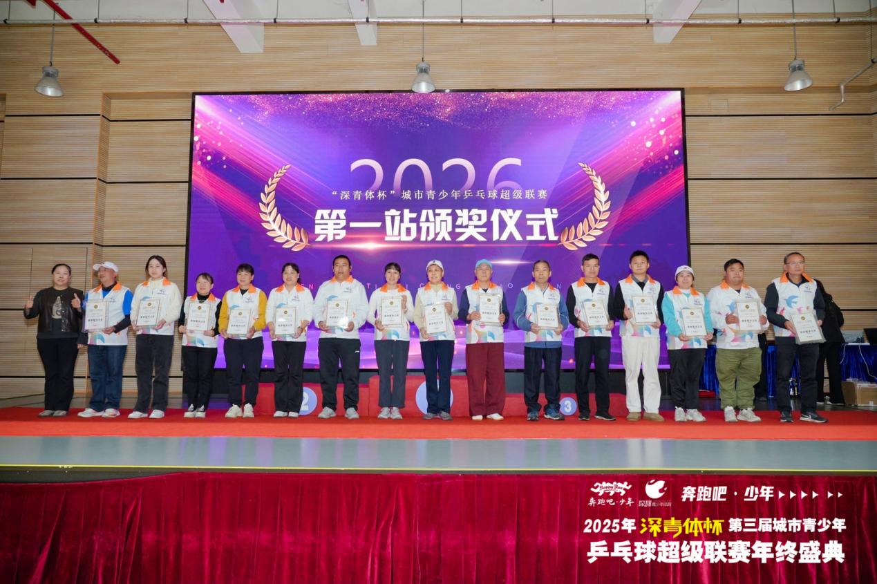 當日下午,2026年“深青體杯”城市青少年乒乓球超級聯(lián)賽第一站賽事頒獎儀式上,林友勛、楊鈺雯、蔣檳帆、劉子萱、陳俊旭、楊亞旋、朱韜璉、王昱揚榮獲分站賽各組別冠軍;值得一提的是,深圳青少年體育還為在37個項目的市錦標賽、5個項目的市球類精英賽默默付出的深圳市青少年體育志愿者頒發(fā)賽事服務之星、技術服務精英、最佳領隊及優(yōu)秀團體等多個獎項,獲獎單位5家,獲得人數(shù)近30人;授予深圳青少年體育合作開展“奔跑吧少年”系列公益活動的深圳市西麗小學、南山區(qū)前海小學、寶安區(qū)青少年業(yè)余體育學校、深圳第一反應人應急救護志愿服務中心、福田區(qū)華富小學、華新小學、寶安區(qū)陸興學校及坪山區(qū)東北師范大學深圳坪山實驗學校等8家單位頒發(fā)了“奔跑吧·少年2025年深圳青少年體育公益合作單位”獎。