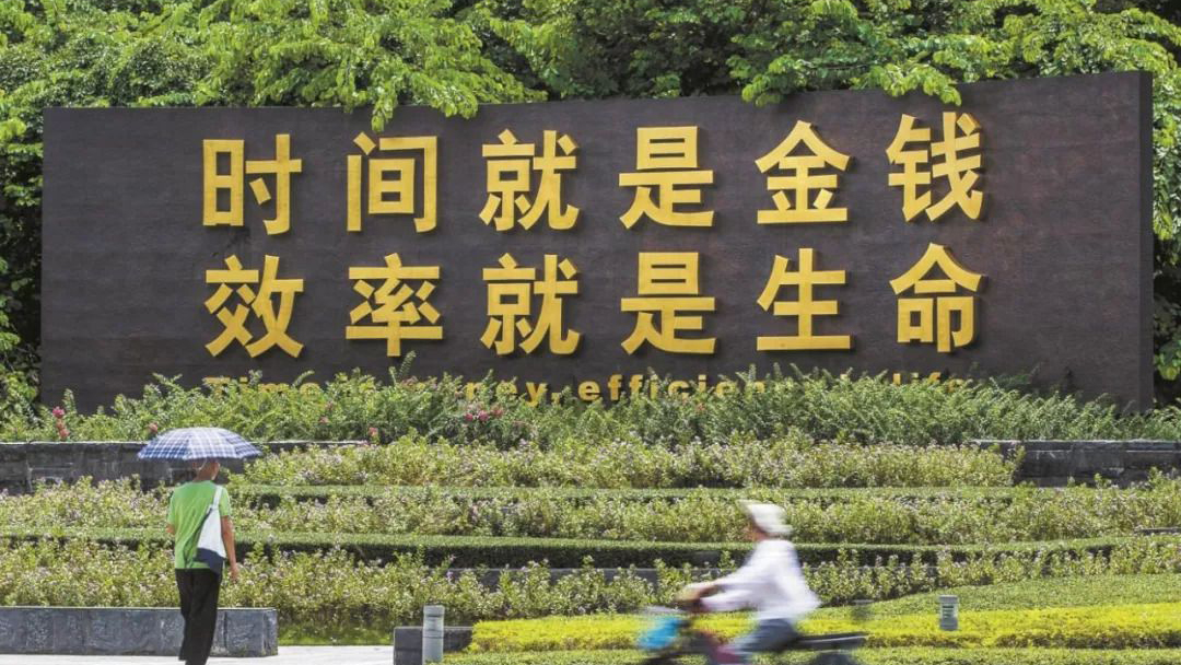 蛇口時(shí)間廣場(chǎng)上矗立著“時(shí)間就是金錢,效率就是生命”標(biāo)語(yǔ)牌