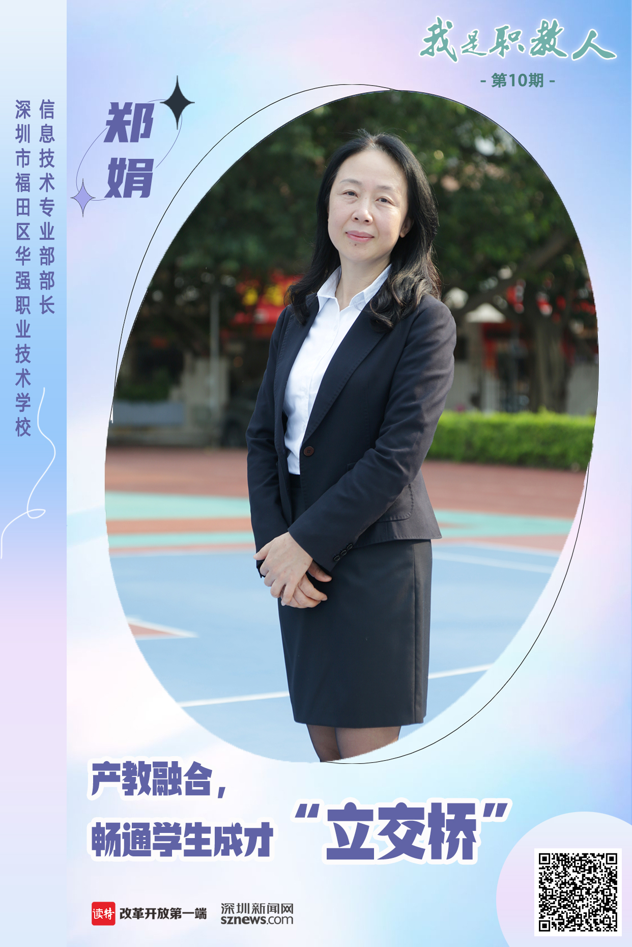 父母的耳濡目染,讓她選擇成為一位教師;職業(yè)教育發(fā)展的重要性,讓她成為了一名職教人,她是深圳市福田區(qū)華強職業(yè)技術(shù)學(xué)校(以下簡稱“華強職校”)信息技術(shù)專業(yè)部部長鄭娟。