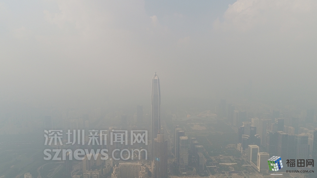 無人機(jī)在數(shù)百米高空俯瞰灰霾籠罩下的深圳中心區(qū),大半個城區(qū)都看不清楚。