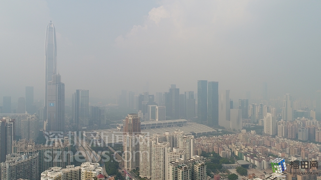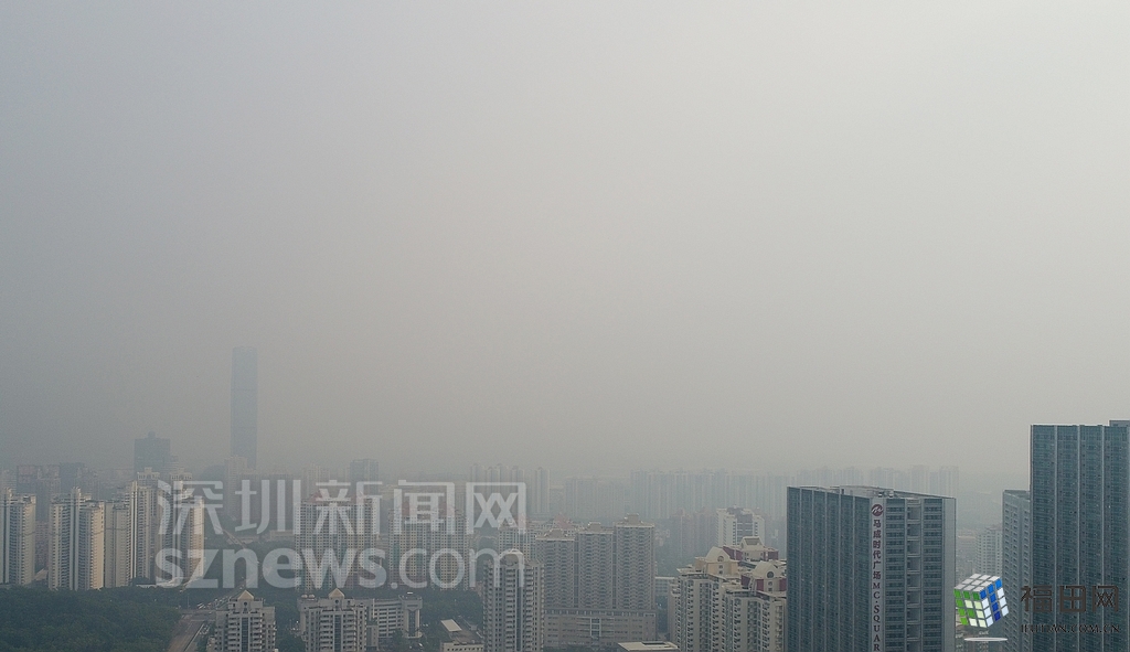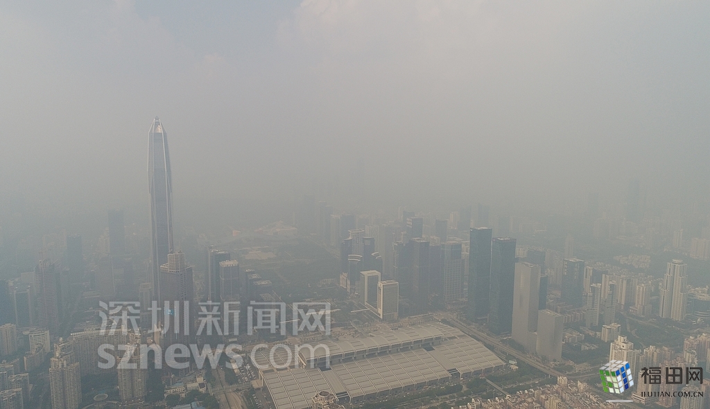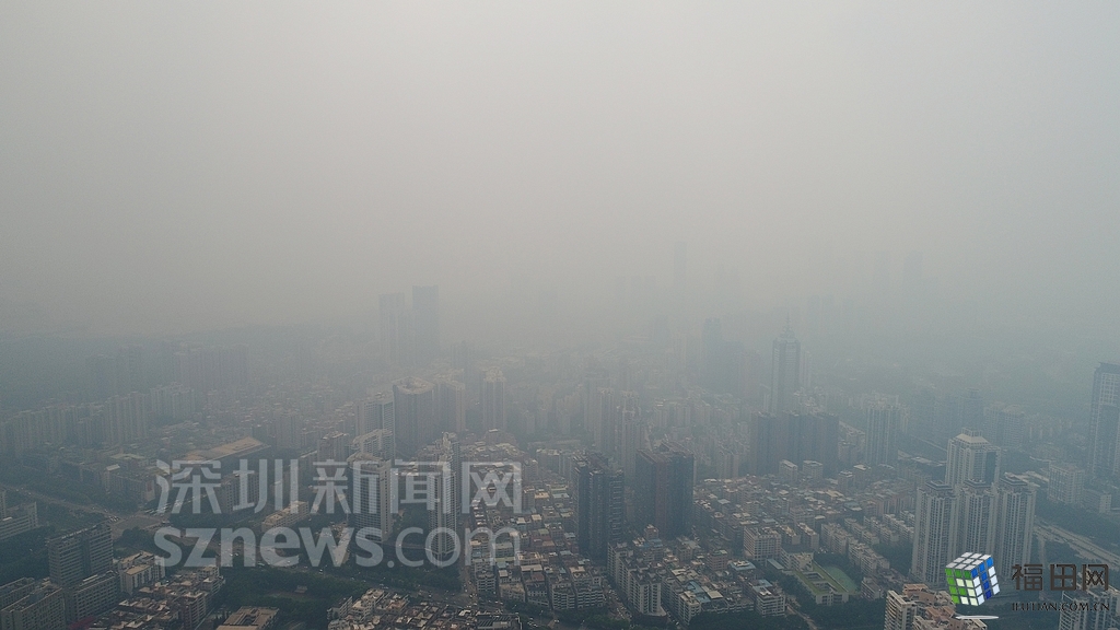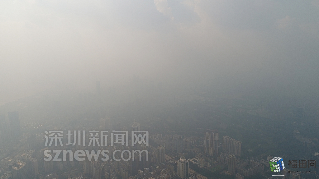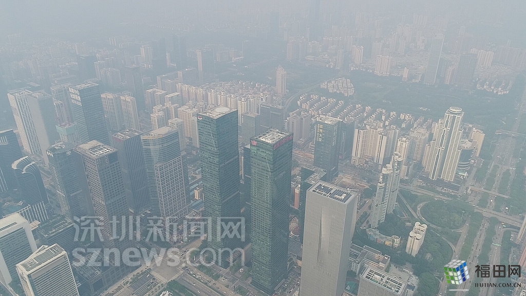 無人機(jī)在數(shù)百米高空俯瞰灰霾籠罩下的深圳中心區(qū),大半個城區(qū)都看不清楚。