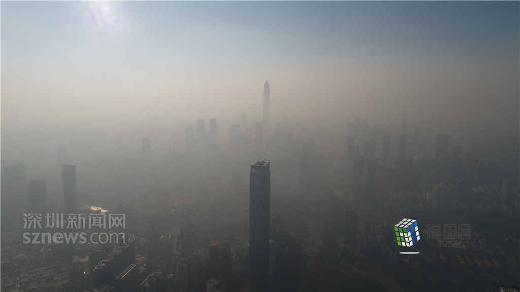 1月18日上午,記者操控?zé)o人機俯瞰深圳中心區(qū)發(fā)現(xiàn),灰霾將天空“割裂”成一道涇渭分明的界線,把城市籠罩得如同一個充滿霧靄的森林。從平安金融大廈的上空遠眺,西南面的深圳灣在灰霾的籠罩下變成了一片“沙漠”,東面的京基一百幾乎被灰霾“吞沒”,北邊平時肉眼可看的梅林山也因為能見度較低變得若隱若現(xiàn),南面的米埔濕地也被云遮霧繞。