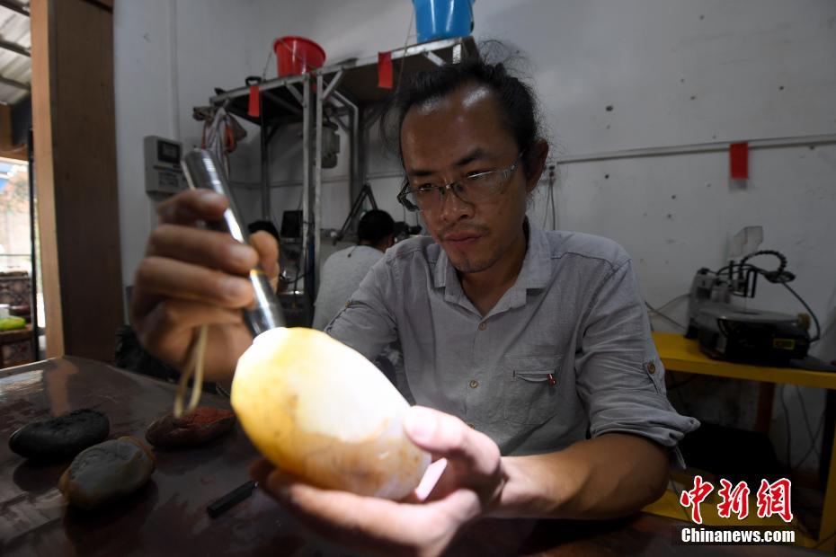 6月20日,廣西南寧市唐人文化街,錢思宇正在審料。1984年的錢思宇出生于湖南懷化,自小喜愛把玩石頭,受父輩影響,從2012年開始從事玉石雕刻工作至今。據(jù)了解,其設(shè)計的壯鄉(xiāng)玉雕作品,以人物為主,采用廣西當(dāng)?shù)靥赜械氖?,結(jié)合壯文化中的銅鼓、壯錦等元素,通過刻畫“壯鄉(xiāng)人”的神態(tài),表達(dá)廣西特有的“壯鄉(xiāng)情”。中新社記者 俞靖 攝