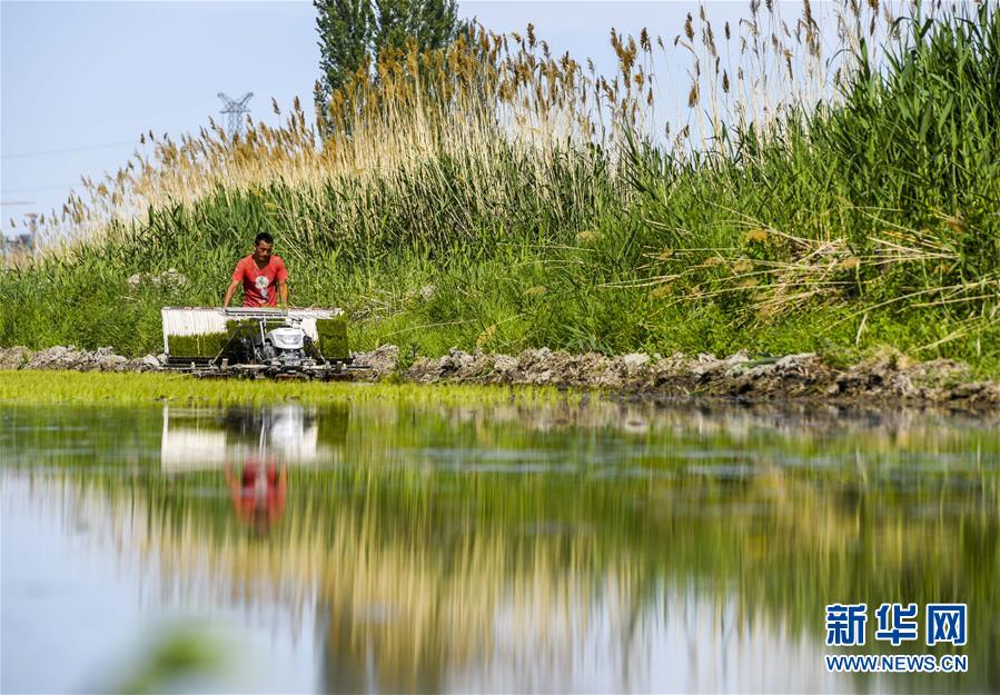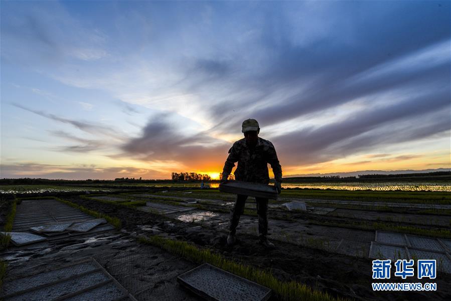 夕陽(yáng)西下,村民在新疆察布查爾錫伯自治縣種羊場(chǎng)托海依村的一處農(nóng)田里勞動(dòng)(5月21日攝)。近日,隨著氣溫漸高,地處新疆伊犁河谷的察布查爾錫伯自治縣迎來(lái)插秧高峰期,田間地頭一派繁忙景象。塊塊稻田水滿如鏡,田間防護(hù)林枝繁葉茂,遠(yuǎn)處雪山依稀可見(jiàn),如一幅在大地上鋪展開(kāi)的生態(tài)畫(huà)卷。新華社記者胡虎虎 攝