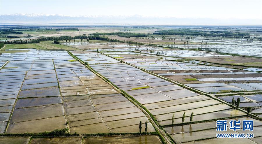 在新疆察布查爾錫伯自治縣扎庫(kù)齊牛錄鄉(xiāng)拍攝的一處水稻田(5月21日無(wú)人機(jī)拍攝)。近日,隨著氣溫漸高,地處新疆伊犁河谷的察布查爾錫伯自治縣迎來(lái)插秧高峰期,田間地頭一派繁忙景象。塊塊稻田水滿如鏡,田間防護(hù)林枝繁葉茂,遠(yuǎn)處雪山依稀可見(jiàn),如一幅在大地上鋪展開(kāi)的生態(tài)畫(huà)卷。新華社記者胡虎虎 攝