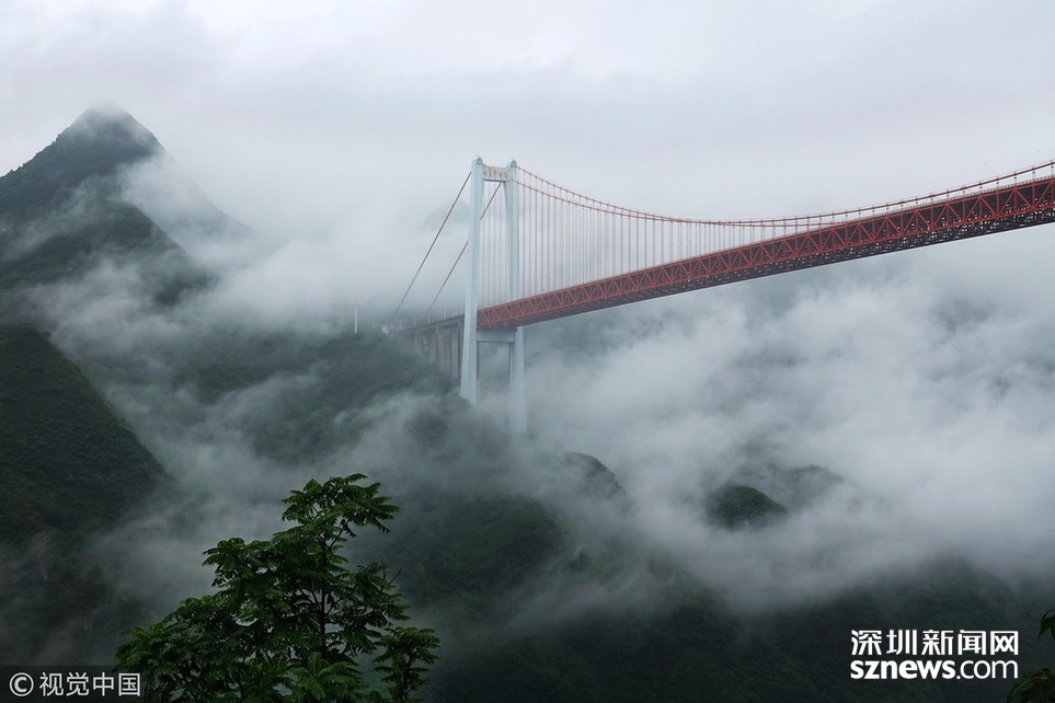 2018年6月26日,一場(chǎng)大雨后貴州省安順市關(guān)嶺縣壩陵河大峽谷云霧繚繞,橫跨兩岸的壩陵河大橋在云霧中時(shí)隱時(shí)現(xiàn),更顯雄偉壯觀。