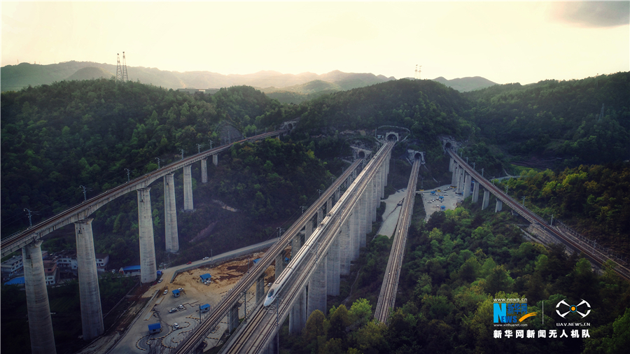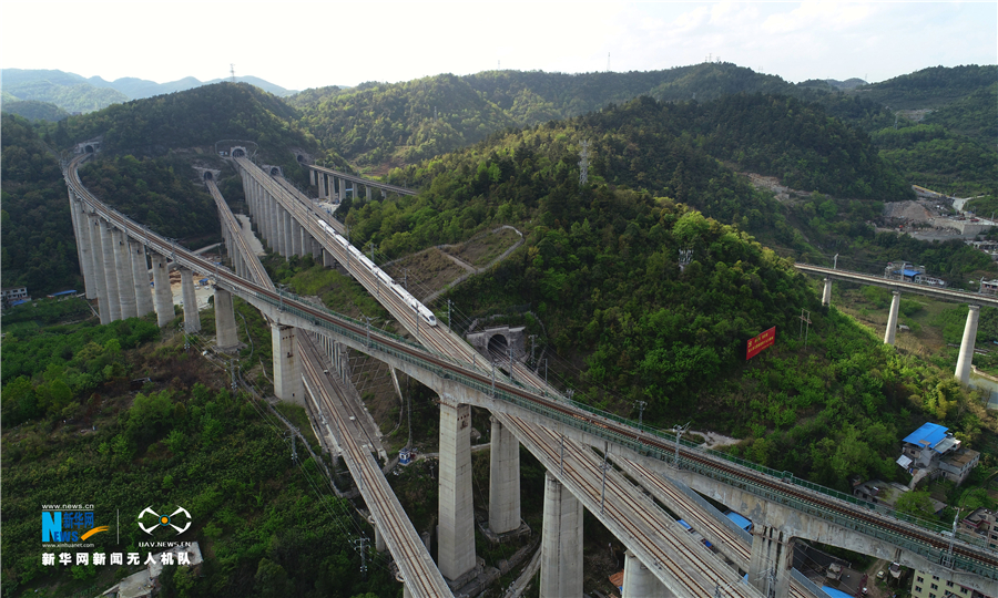 5月16日,航拍貴陽(yáng)市郊交織的五條高鐵線路,一列動(dòng)車駛出隧道。貴州省地處中國(guó)西南腹地,高原山地居多,因此高鐵建設(shè)的橋隧占比較高。在貴陽(yáng)市烏當(dāng)區(qū)新添寨,高鐵滬昆線、貴廣客運(yùn)專線、貴開(kāi)城際客運(yùn)專線的隧道和橋梁交織在一起,形成“五洞五橋”并行。中新社記者賀俊怡 攝 5月16日,一列動(dòng)車從貴陽(yáng)市郊交織的橋梁上駛過(guò)。貴州省地處中國(guó)西南腹地,高原山地居多,因此高鐵建設(shè)的橋隧占比較高。在貴陽(yáng)市烏當(dāng)區(qū)新添寨,高鐵滬昆線、貴廣客運(yùn)專線、貴開(kāi)城際客運(yùn)專線的隧道和橋梁交織在一起,形成“五洞五橋”并行。中新社記者賀俊怡 攝