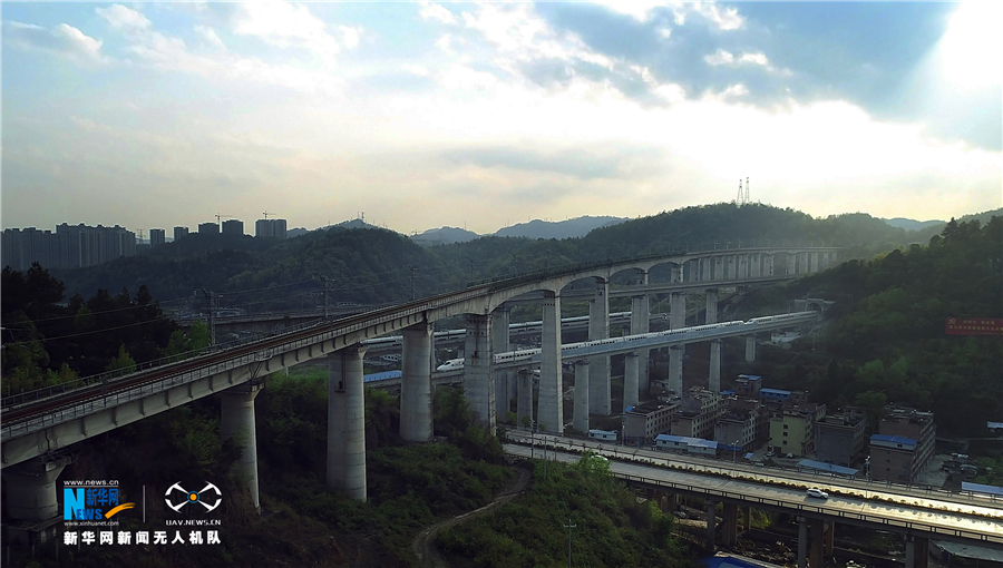 貴州省地處中國西南腹地,全省高原山地居多,因此高鐵建設(shè)的橋隧占比較高。在貴陽市烏當(dāng)區(qū)新添寨,高鐵滬昆線、貴廣客運專線、貴開城際客運專線的隧道和橋梁交織在一起,形成“五洞五橋”并行,形似“五龍出海”的壯觀景象。圖為3月29日,新華網(wǎng)無人機航拍兩輛動車在線路上會車。新華網(wǎng)周遠鋼 攝