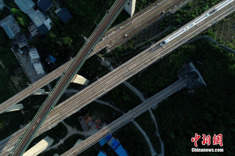 5月16日,航拍貴陽市郊交織的五條高鐵線路,一列動車駛出隧道。貴州省地處中國西南腹地,高原山地居多,因此高鐵建設(shè)的橋隧占比較高。在貴陽市烏當(dāng)區(qū)新添寨,高鐵滬昆線、貴廣客運專線、貴開城際客運專線的隧道和橋梁交織在一起,形成“五洞五橋”并行。中新社記者賀俊怡 攝