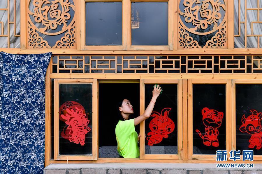 在寧夏固原市西吉縣吉強鎮(zhèn)龍王壩村,一名服務(wù)員在“窯洞賓館”擦玻璃(8月30日攝)。