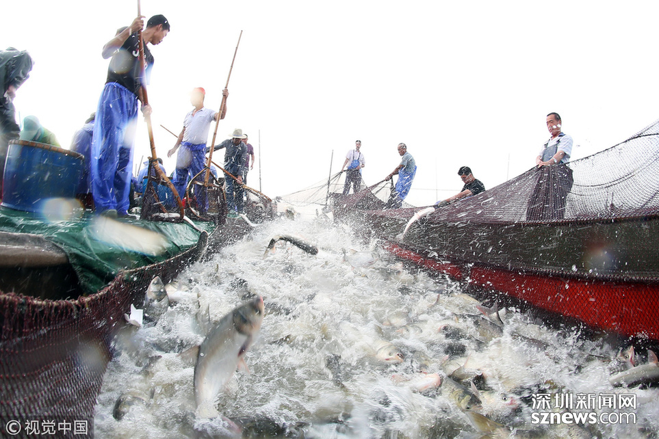 2018年6月26日,江蘇省常州市嘉澤鎮(zhèn)捕撈村的漁民組織夏季捕撈,一網(wǎng)魚達(dá)五萬余斤,以鰱魚為主,供應(yīng)市場(chǎng)需求。夏捕的魚價(jià)較平時(shí)有所上漲,漁民粗略估計(jì)可增收上萬余元。