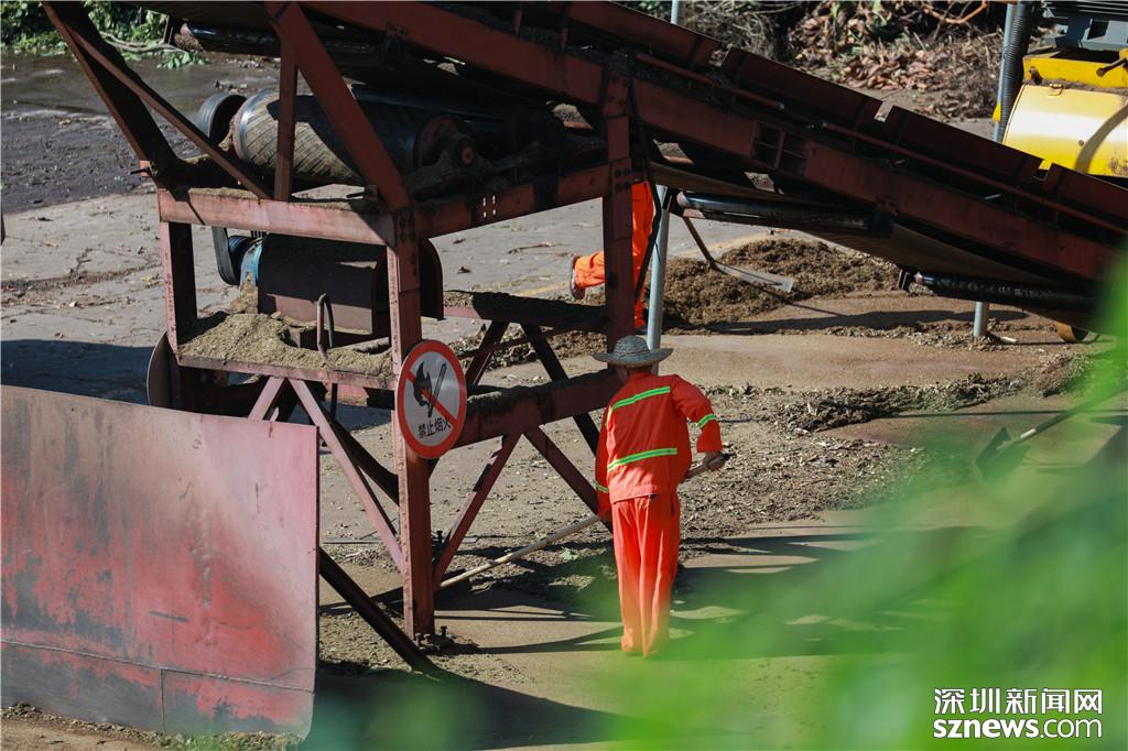 工作人員將遺漏在傳送帶下的碎料鏟出至臨時堆放處