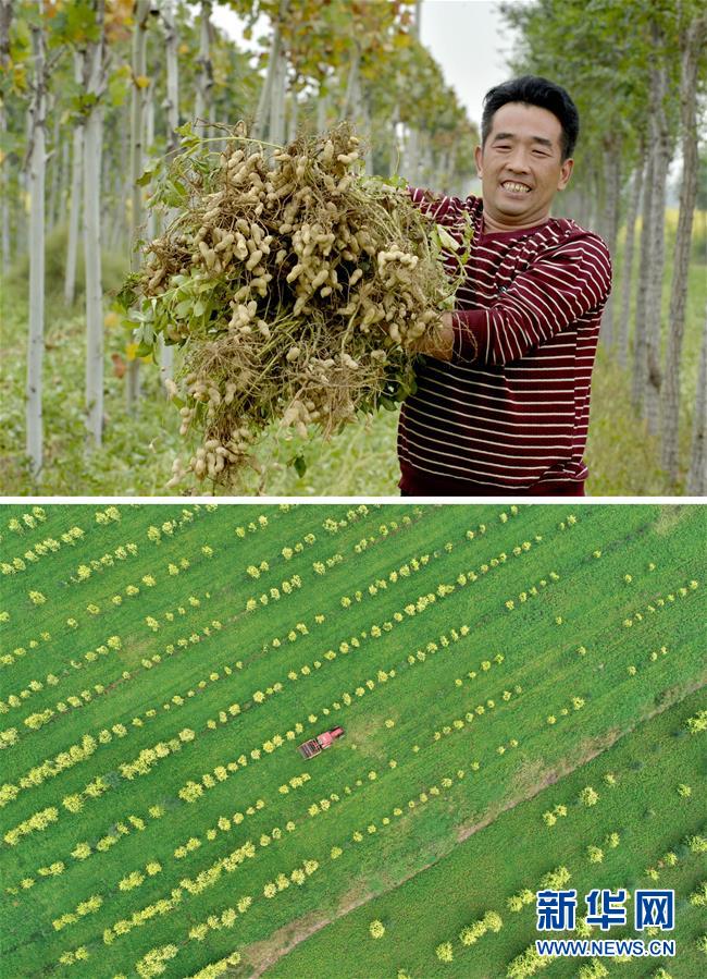 這張拼版照片顯示的是:上圖,9月18日,河北邢臺(tái)經(jīng)濟(jì)開(kāi)發(fā)區(qū)郭龍莊村農(nóng)民王路坤展示收獲的花生;下圖,9月18日,王路坤駕駛農(nóng)機(jī)收獲花生(無(wú)人機(jī)拍攝)。 新華社記者牟宇攝