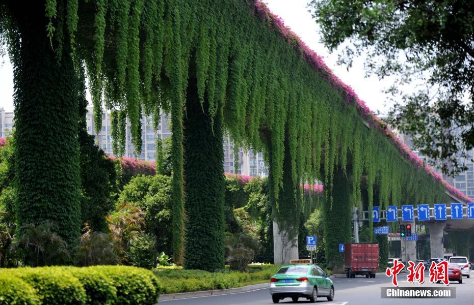 5月13日,福州市區(qū)一立交橋長滿了枝葉繁茂的爬山虎,遠(yuǎn)遠(yuǎn)望去,好像穿上了一件“綠衣”,成為福州街頭一景。中新社記者 張斌攝