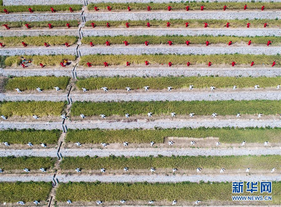 9月29日拍攝的秋日中的建德市大洋鎮(zhèn)高垣村梯田風景。當日,2000多名太極拳愛好者在浙江省建德市大洋鎮(zhèn)高垣村的千畝梯田上參加太極拳表演,吸引很多當?shù)厝撕陀慰颓皝碛^賞,助力當?shù)亟鹎飼r節(jié)鄉(xiāng)村旅游。近兩年來,大洋鎮(zhèn)充分利用土地整治后形成的千畝梯田打造農(nóng)業(yè)觀光綜合體,發(fā)展綜合型農(nóng)業(yè)觀光旅游,為鄉(xiāng)村振興注入新活力。新華社記者徐昱攝