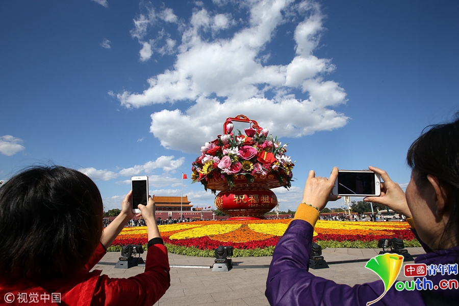 2018年9月29日,北京迎來(lái)高顏值好天氣,天安門廣場(chǎng)“祝福祖國(guó)”花壇在藍(lán)天白云映襯下壯美如畫。游客紛紛拿起手機(jī)、相機(jī)拍照留影充滿節(jié)日氣氛。