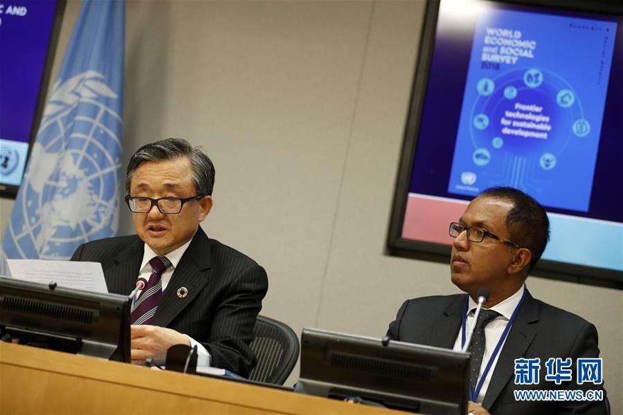 10月8日,在位于紐約的聯(lián)合國(guó)總部,聯(lián)合國(guó)負(fù)責(zé)經(jīng)濟(jì)和社會(huì)事務(wù)的副秘書長(zhǎng)劉振民(左)向記者介紹《2018年世界經(jīng)濟(jì)和社會(huì)概覽》。新華社記者李木子攝
