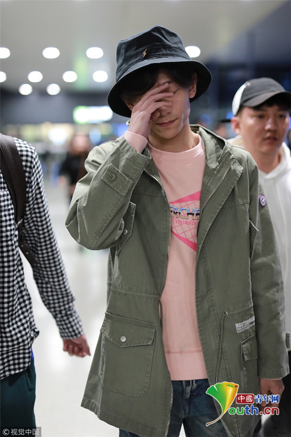 2018年10月14日,上海,張一山抵達(dá)上海機場。張一山戴漁夫帽眼袋嚴(yán)重瞬間老十歲, 用手擋臉?biāo)撇辉干乡R。