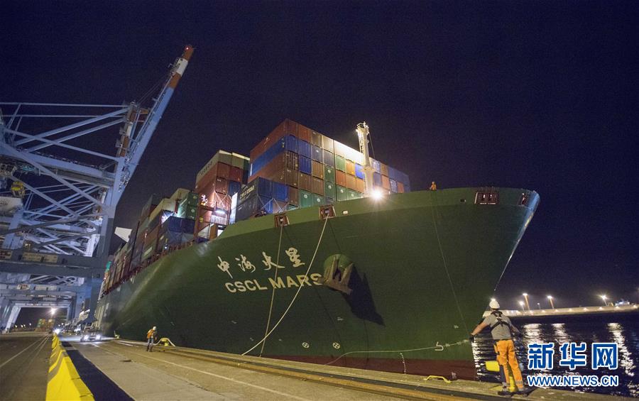 10月15日晚,中遠(yuǎn)海運(yùn)旗下的“中海火星”號集裝箱輪??吭诒壤麜r澤布呂赫港集裝箱碼頭。 新華社記者 葉平凡 攝