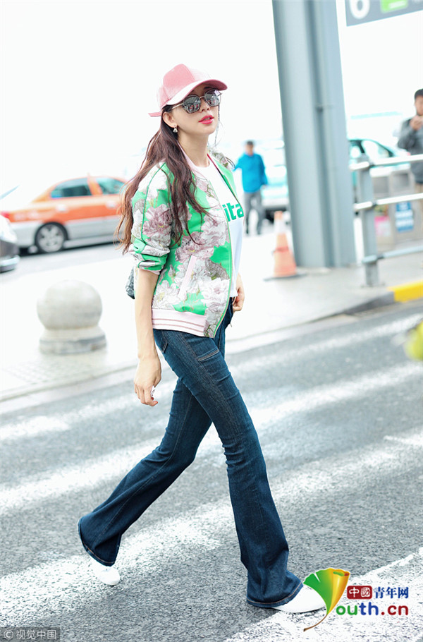 2018年10月16日,上海,林志玲亮相機場,她身穿綠色印花外套搭配粉色鴨舌帽十分清新靚麗,乖乖坐小車抿嘴甜笑比V嘟嘴頻賣萌。