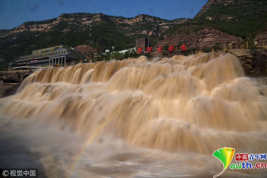 5月31日,山西臨汾奔騰咆哮的黃河壺口瀑布吸引游客。近日,受上游地區(qū)降雨量增多影響,黃河干流晉陜峽谷水量大增,每秒流量達(dá)到1100立方,是常年同期的三倍,壺口瀑布出現(xiàn)五月份罕見(jiàn)的瀑布群景觀,吸引了眾多游客。圖片來(lái)源:視覺(jué)中國(guó)