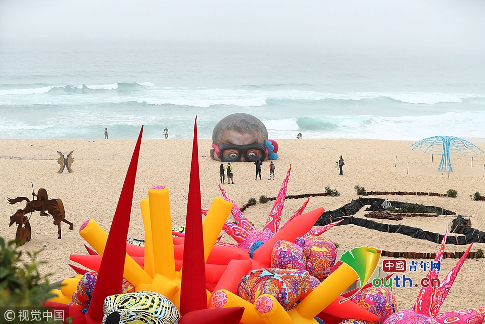 慎點!澳大利亞邦迪海灘雕塑展一幕