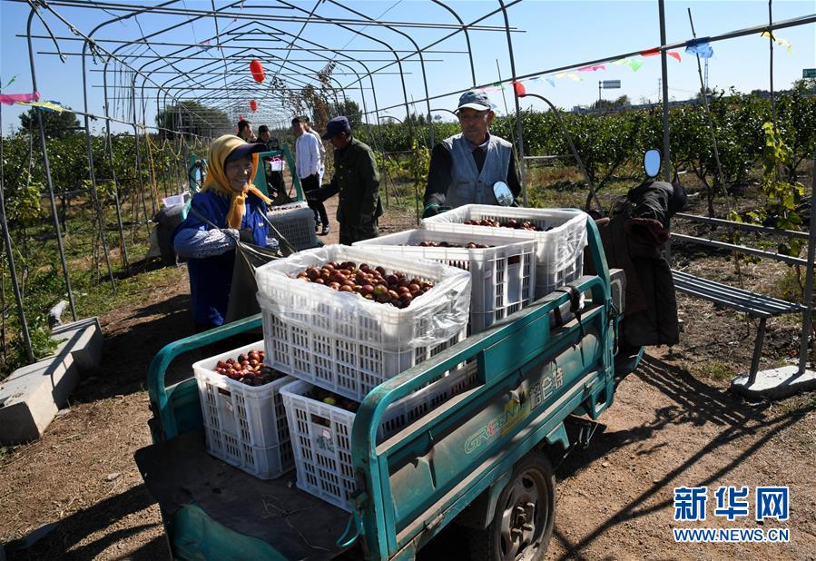 10月17日,在山東省青島市即墨區(qū)藍(lán)村鎮(zhèn)王演莊北村,種植戶(hù)在果園里收集采摘的大棗。 金秋時(shí)節(jié),農(nóng)民們忙著收獲成熟的農(nóng)作物,喜迎豐收。 新華社記者 李紫恒攝