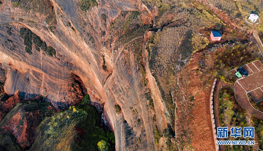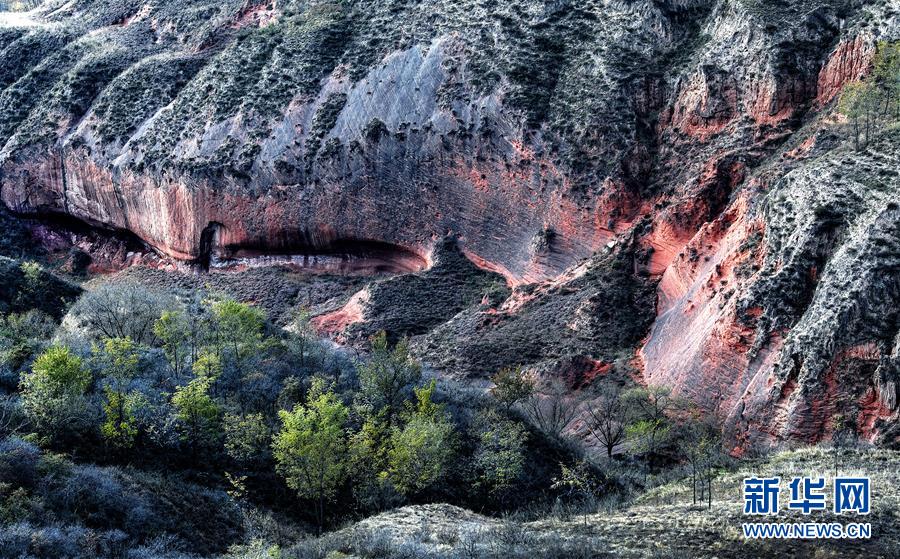 在黃土高原的陜西省延安市安塞區(qū)坪橋鎮(zhèn)王家灣,有一處峽谷丹霞地貌,是2017年陜西省地質(zhì)調(diào)查院在陜北及渭北地區(qū)發(fā)現(xiàn)大規(guī)模丹霞地貌的一部分。這里的山勢頂部被黃土覆蓋,底部經(jīng)流水下切侵蝕紅色砂巖外露,出露的巖石紋理如波浪,深秋中猶如一幅流動的畫卷。