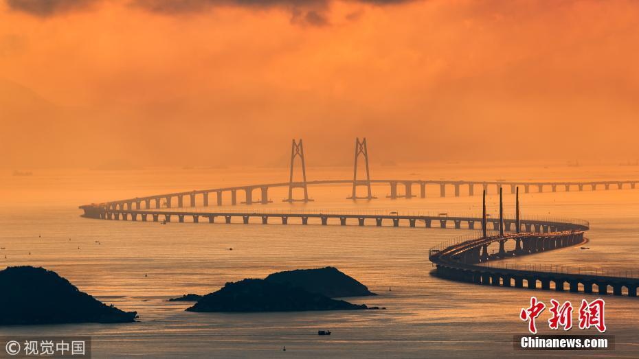 2018年5月21日,廣東珠海,太陽(yáng)從香港大嶼山慢慢升起,港珠澳大橋猶如一條巨龍蜿蜒盤(pán)繞在海面上。