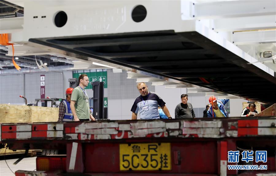 10月22日,德國工程師馬丁·霍爾茨海德(中)在吊裝過程中查看“金牛座”龍門銑床床身位置。 當(dāng)日,來自德國的首屆進口博覽會最大展品——“金牛座”龍門銑床完成初步組裝,將運往國家會展中心(上海)3號館進行最后的安裝施工。這是德國瓦德里希科堡公司研發(fā)的機床設(shè)備,高約8米,占地面積約200平方米,將在智能及高端裝備區(qū)進行展出。 新華社記者方喆攝