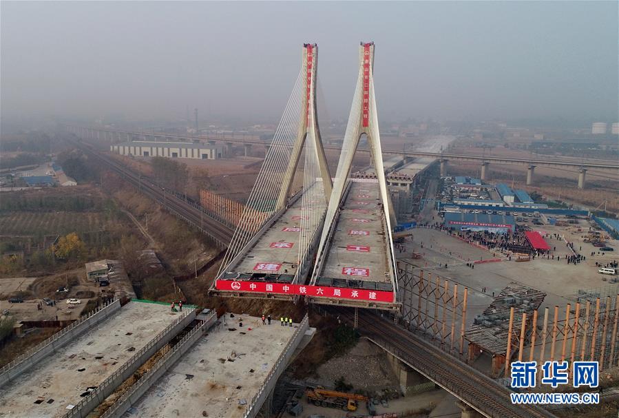 10月25日,唐山市二環(huán)路項目上跨津山鐵路斜拉橋在轉(zhuǎn)體中(無人機(jī)拍攝)。 當(dāng)日,河北省唐山市二環(huán)路項目上跨津山鐵路斜拉橋轉(zhuǎn)體成功。據(jù)介紹,該橋總長927.5米,主橋由斜拉轉(zhuǎn)體橋和轉(zhuǎn)體T構(gòu)橋組成,轉(zhuǎn)體總重5.1萬噸,其中斜拉轉(zhuǎn)體橋重3.3萬噸,主塔高達(dá)80.5米,為曲線變截面“雙人字”形空心塔,自上而下共有128根斜拉索。 新華社記者楊世堯攝