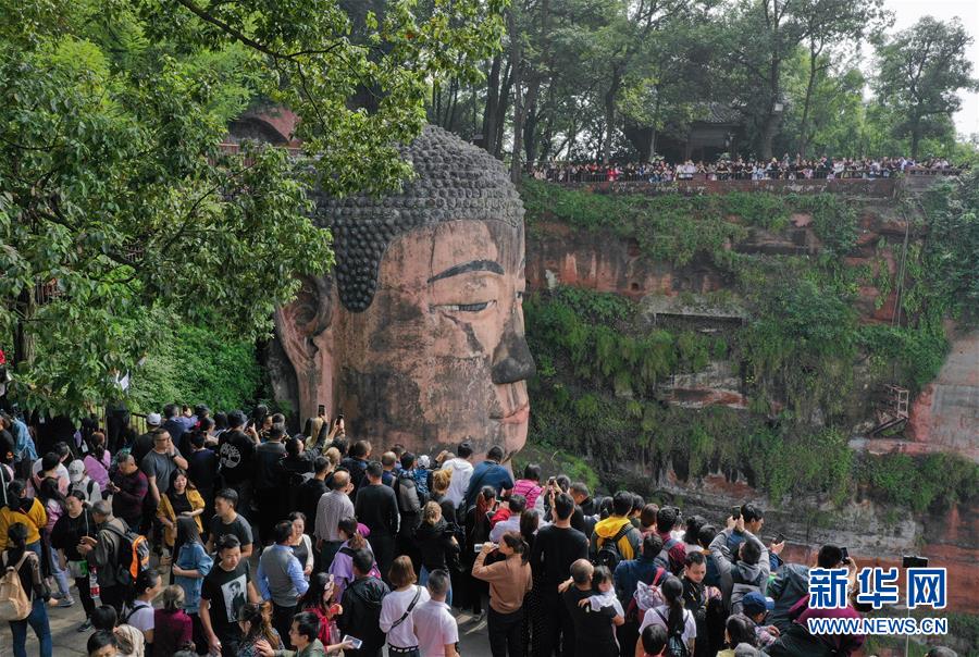 10月4日,游客在樂山大佛前排隊(duì)一睹大佛真容(無人機(jī)拍攝)。 新華社記者 江宏景 攝