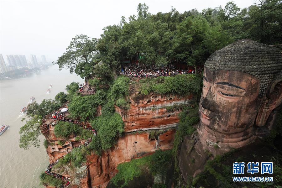 10月4日,游客在樂山大佛景區(qū)的棧道上有序排隊(duì),一睹大佛真容。 新華社記者 江宏景 攝