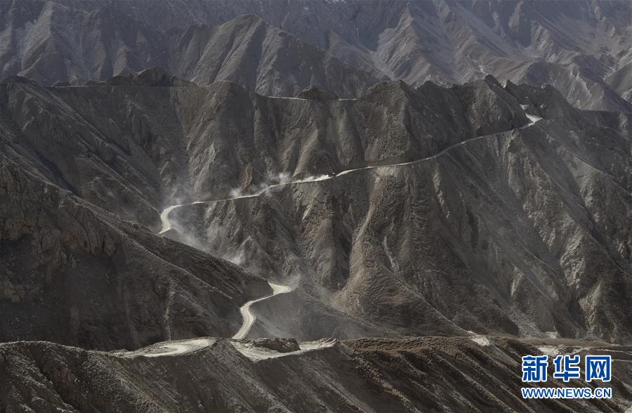 在距離且末縣縣城160多公里的昆侖山上的興發(fā)達玉礦,可見對面山上運載銅鋅礦礦石的卡車行駛在簡易礦山公路上(10月23日攝)。 新華社記者武巍攝