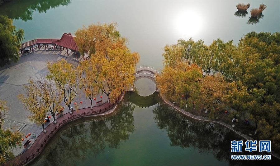 寧夏銀川市閱海公園秋景(10月22日無人機(jī)拍攝)。