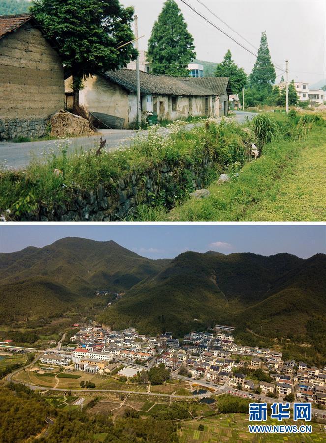拼版照片:上圖為浙江省湖州市安吉縣天荒坪鎮(zhèn)余村村1988年時的資料照片;下圖為2018年3月23日無人機拍攝的浙江省安吉縣天荒坪鎮(zhèn)余村村(新華社記者黃宗治攝)。新華社記者 黃宗治 攝