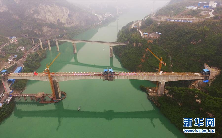 在重慶涪陵拍攝的渝懷鐵路涪秀二線重點工程——烏江右線大橋(10月23日無人機拍攝)。 10月23日,由中鐵四局承建的渝懷鐵路涪秀二線重點工程——烏江右線大橋主跨成功合龍,標志著大橋主體工程全部順利結束。烏江右線大橋項目全程460.1米,主跨192米,跨越烏江和319國道。在兩年多的建設過程中,施工人員攻克了“不等高墩”“不對稱邊跨”“邊跨入隧”等多個技術難題。 新華社記者王全超攝