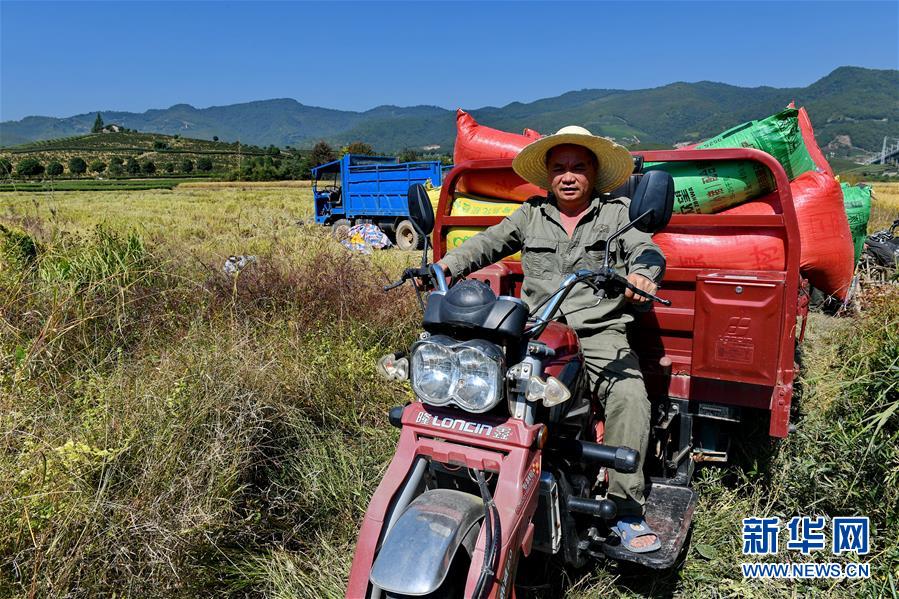 10月31日,武夷山市興田鎮(zhèn)南岸村農(nóng)民在運(yùn)輸收獲的稻谷。 新華社記者 張國俊 攝