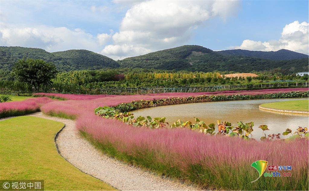 由于這些粉色亂子草圍繞一個(gè)圓形的池塘種植,從空中俯瞰則是另外一番景象,湖心島、池塘,粉黛、草坪與周邊的綠色植物形成了一個(gè)特別的唯美圖案。
